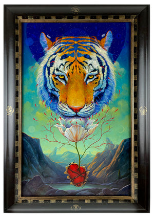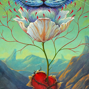 “The Triumph” A painting about overcoming obstacles, about rebirth, renewal, and breaking bonds to reach beyond. Thorny vines like those wrapped around the heart lurk throughout the series. If you look closely there is a heron in the distance, standing in the water.