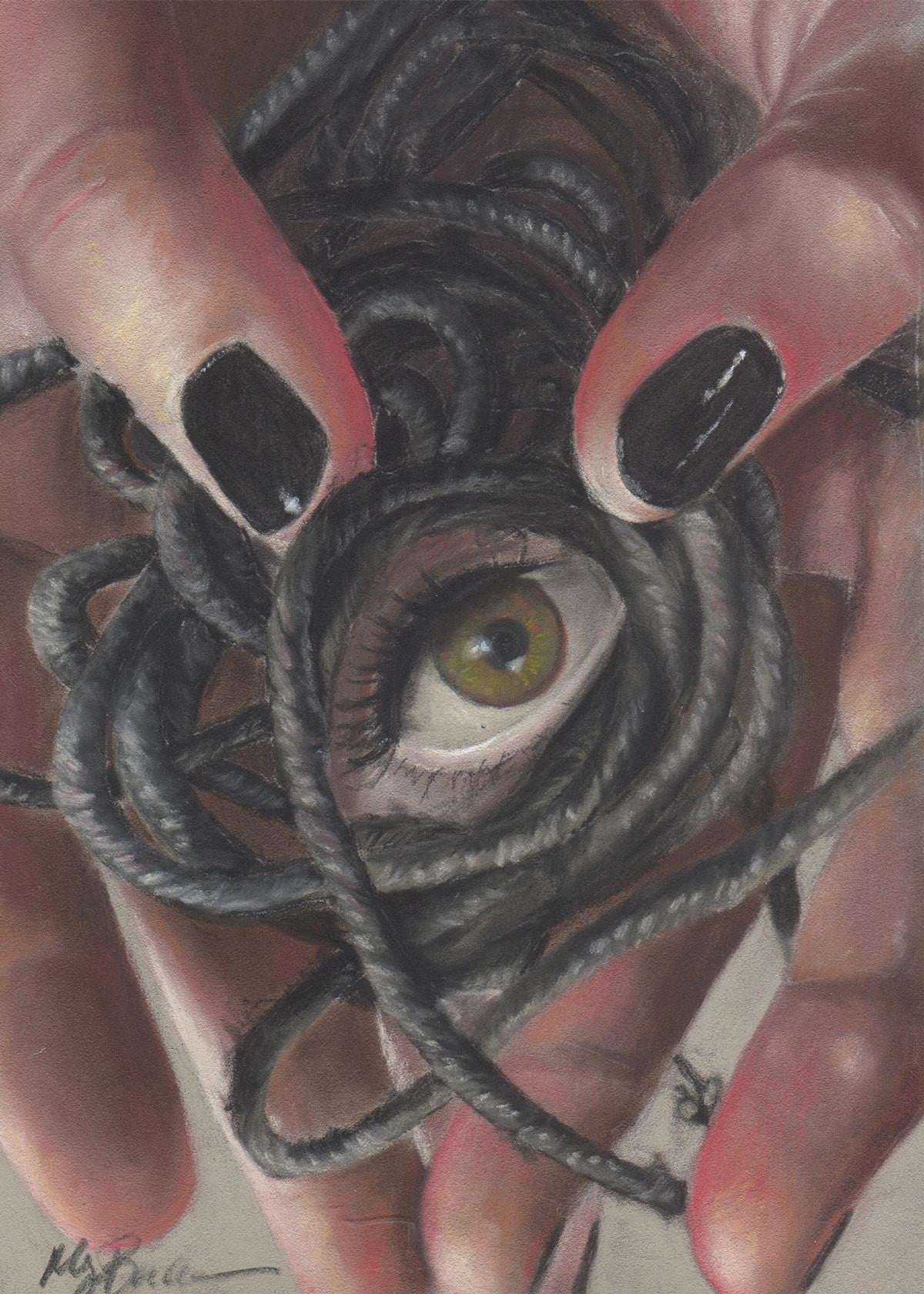“My daily struggle through anxiety has brought me through isolation, melancholy, and eventually the cathartic release of its grip, all of which I seek to express through the details of my work.  The oil paintings’ sticky strings represent my sense of understanding of how anxiety appears and its hold of every aspect of my life.  Additionally, the strings connect different facets of my life, seeming to strangle me and other sufferers.  The soft pastels and small bits of dust-like metallic leaf drifting through some of the works represents the lifting of the anxiety and my emergence from its disorienting fog.”