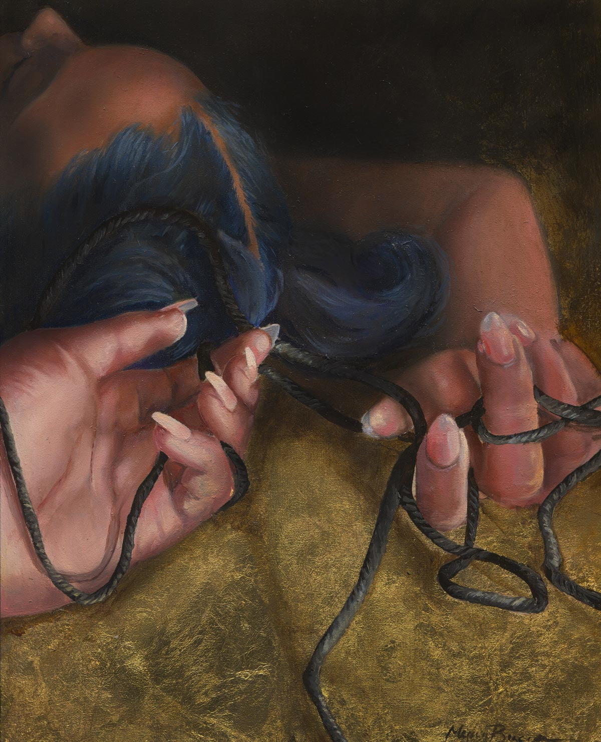 “My daily struggle through anxiety has brought me through isolation, melancholy, and eventually the cathartic release of its grip, all of which I seek to express through the details of my work.  The oil paintings’ sticky strings represent my sense of understanding of how anxiety appears and its hold of every aspect of my life.  Additionally, the strings connect different facets of my life, seeming to strangle me and other sufferers.  The soft pastels and small bits of dust-like metallic leaf drifting through some of the works represents the lifting of the anxiety and my emergence from its disorienting fog.”