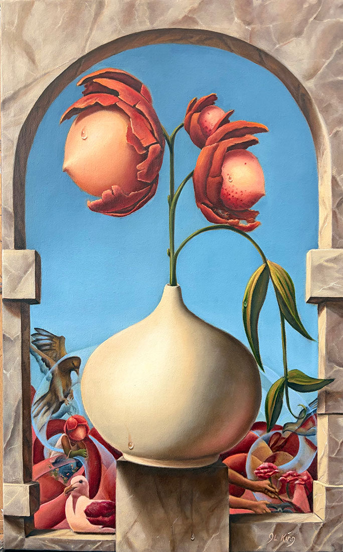 • J.L. King, is a second generation San Francisco native, Chinese-African American, born from artist parents and raised with a strong reverence for the arts. Her childhood memories of her large multiracial family, the strong scent of oil paints, turpentine, and the theater walls within San Francisco’s City College Campus have left long lasting impressions. Jennifer pursued a career in health and science while maintaining her creative practice in different mediums before committing her focus to oil painting. Sharp-focus detail is a lifelong endeavor that she pursues to this day. She practices her art out of her studio in the South Of Market neighborhood in San Francisco, California.