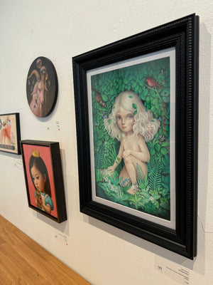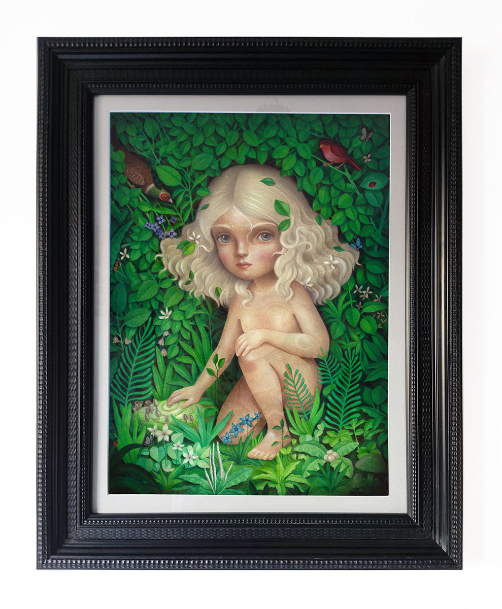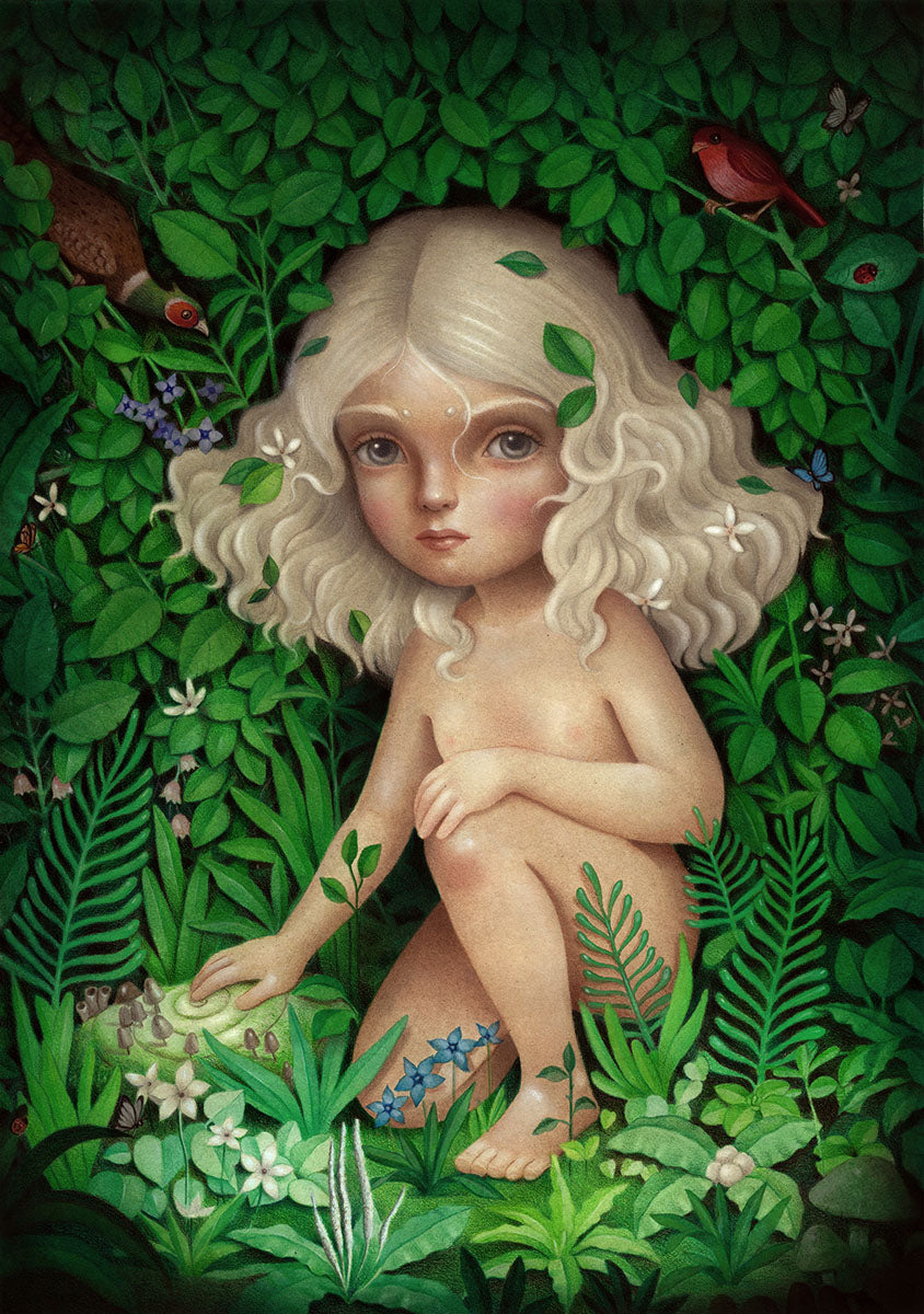 “I try to represent all that is pure and innocent. I use the combo of beauty & truth as a kind of banner when I speak about my role in the art bussiness and my ideals about it. I find innocence and fragility fascinating matters to explore. Ultimately, art for me is a healing medium, so everything I create follows this direction. I help myself (and hopefully others too) to maintain a vivid aspect of the magic world around us, the cultivation of imagination and romanticism, might it be through the representation of little innocent girls or fantastic creatures.” – Raúl Guerra