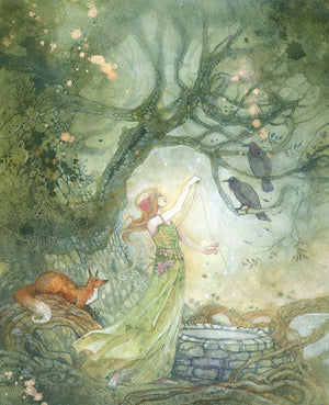 Yggdrasil has three roots, each at a well. The first well, Hvergelmir, is deep below thick ice, the well of poison, but also the well of life, and from which the first living beings were created. A dragon lies here and chews upon the root. His foil is an eagle who lives at the top of the tree, and the two communicate enmity via messages carried up and down Ygdrassil’s vast trunk by a squirrel. The second root lies at Mimir’s well, the well of wisdom, and the third root is tended to by the three Norn fates (past, present, future), Urd, Verdanai, and Skuld, at Urd’s well.