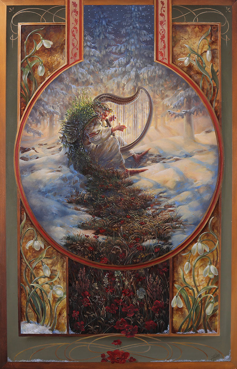 J. Henry "The theme in a lot of this work comes from “untold tales,” vignettes of characters participating in a world separate from ours. I wanted to reflect the experience that one might have in a museum, when you stumble across a really weird piece of art from ages ago, whose purpose was to tell lessons and sing songs, but the aesthetic canons and technical methods of the time make it much more than just that, both foreign and familiar at the same time. Additionally, whether in a piece’s detail or entirety, I wanted to explore the idea of architectural ornament coming to life. I don’t like the idea that today’s generation of design robs the public of celebrating and being surrounded by the applied arts. (Everybody deserves gargoyles and acanthus leaves.) When enough care is put into detail, not only is it a more cherished product as a whole but that detail can take on a life of its own, stimulating the mind to create stories and training the eye to see beauty everywhere, which is essential for personal harmony in the best and the worst of times. This collection of paintings began with a fascination of rocaille grotesque, a newfound interest that started when I began studying architectural ornament, faux finish and trompe l’oeil as scenic painter for theater. This threw me down a rabbit hole of exploring the themes and motifs of historical ornament and costume that helped me set the world of these paintings in a grounded, albeit fantasy, time period. It also reawakened a lot of forgotten influences, like woodcarving and tattoo art, that, now with different eyes, I could draw parallels to to help me make design choices and technical decisions. The most beautiful designs are always ones that celebrate the shapes of nature. As a final kind of fun note, this body of work was done over the course of the last two years. A lot of them follow “palette phases,” and can kind of be identified chronologically by their overarching color."