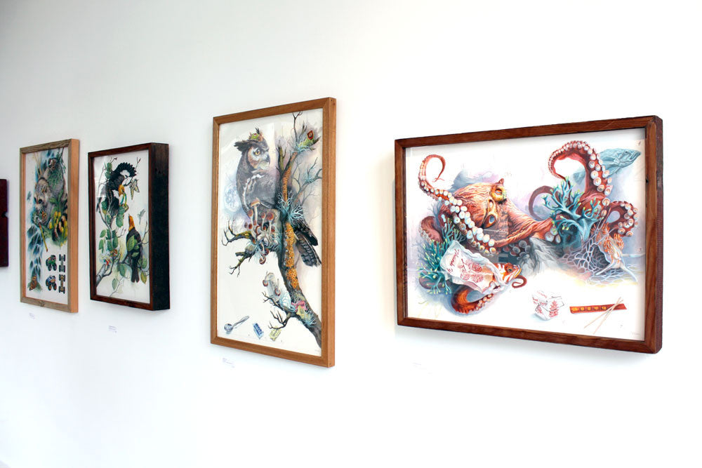 • J.S. Weisgraduated from James Madison University in 2005 with a BFA and a concentration in printmaking. Weis began exhibiting his artwork internationally as well as across the United States in 2014. His current works mix flora, fauna, and little artifacts of human production, exploring the space between the idealized purity of nature and the day-to-day consumption that threatens it. The artist currently live in Portland, OR.