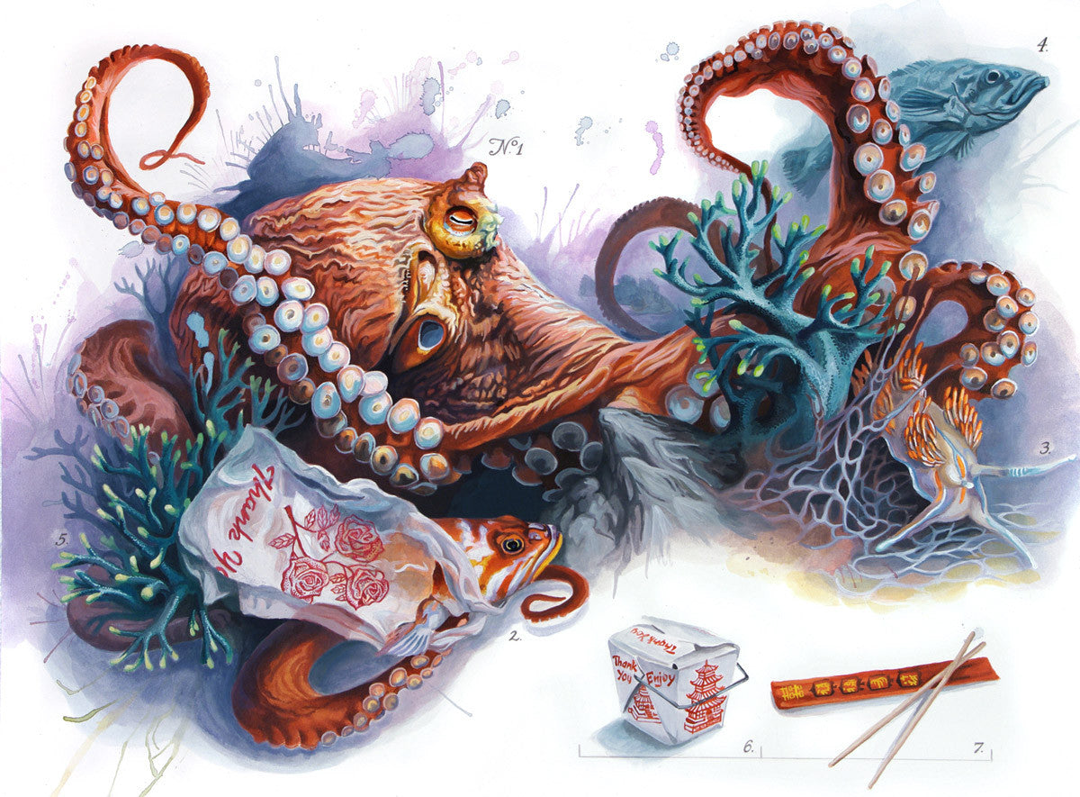 I found a way forward looking through the prints of Enlightenment era naturalists like Ernst Haeckel and John James Audubon. I imagined what it would be like if an alien Audubon came to earth now and began cataloguing the things he saw with a stoic, scientific eye. Would he separate what nature makes and what we make? What would an alien naturalist’s painting look like if the nice, neat division between nature-made and man-made were taken away? In a way the things we make are made by nature, since we originate from nature. Reflecting on the question further, I noticed that when I would go hiking or camping I inevitably found discarded artifacts of human production, and so it felt authentic to my lived experience that I should start including these objects. As I worked on this body of paintings I discovered that by studying the small products that human beings crank out side by side with plants and animals I could relate a natural ecosystem to the encroaching system of human production that feeds off of it. By comparing the abundance of a renewing natural world next to the illusion of abundance that we sell to ourselves, I could explore ideas about why we build the way we do and the needs these products attempt to fulfill. Though the idea that nature has something to teach us about ourselves may seem quaint and old-fashioned, I still think that many of our best ideas come from listening closely to what it has to say.