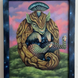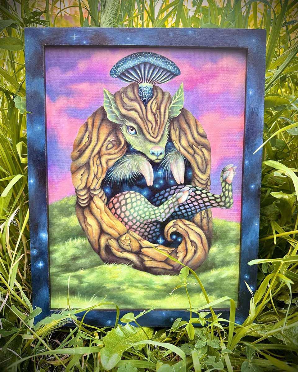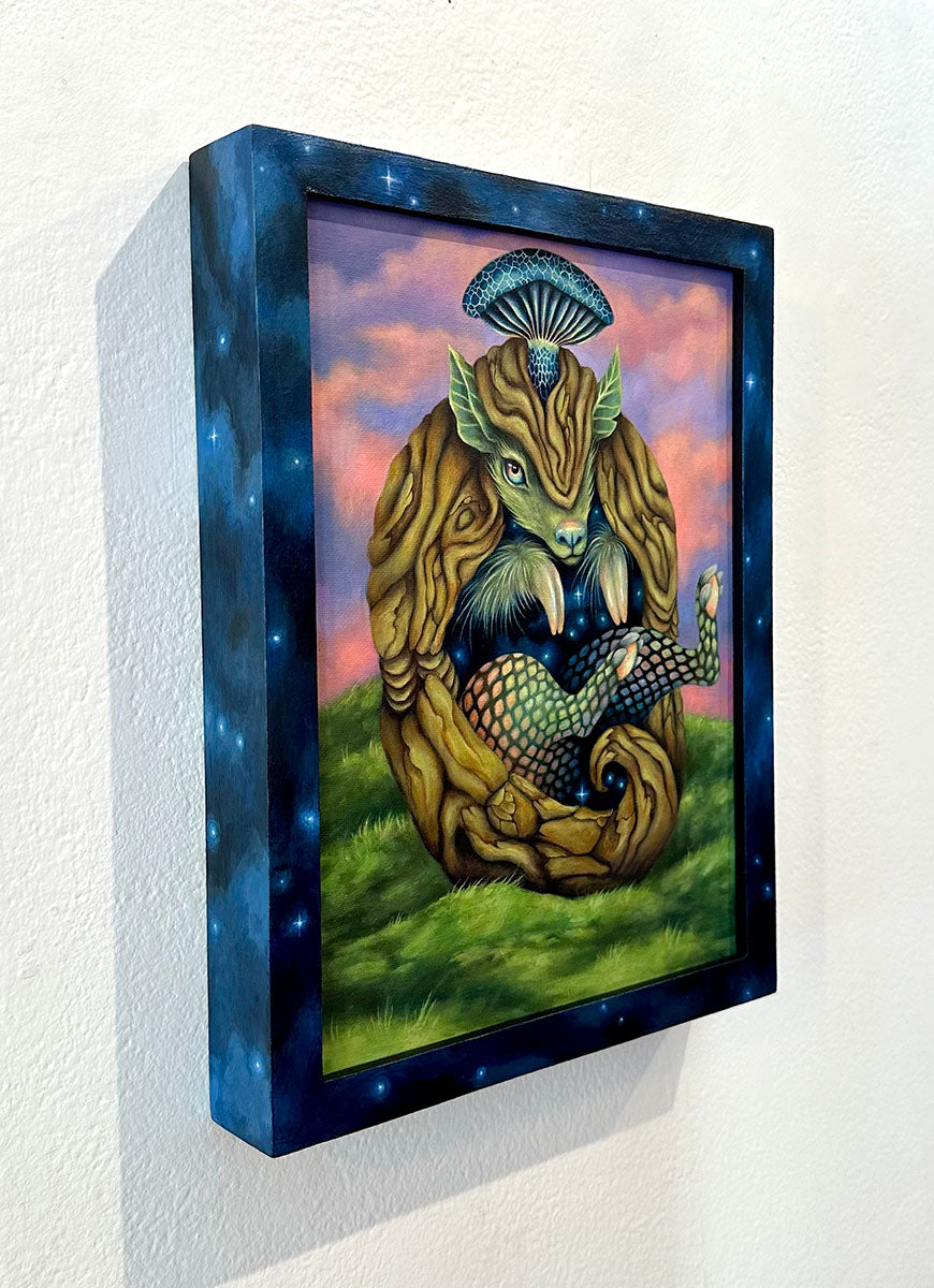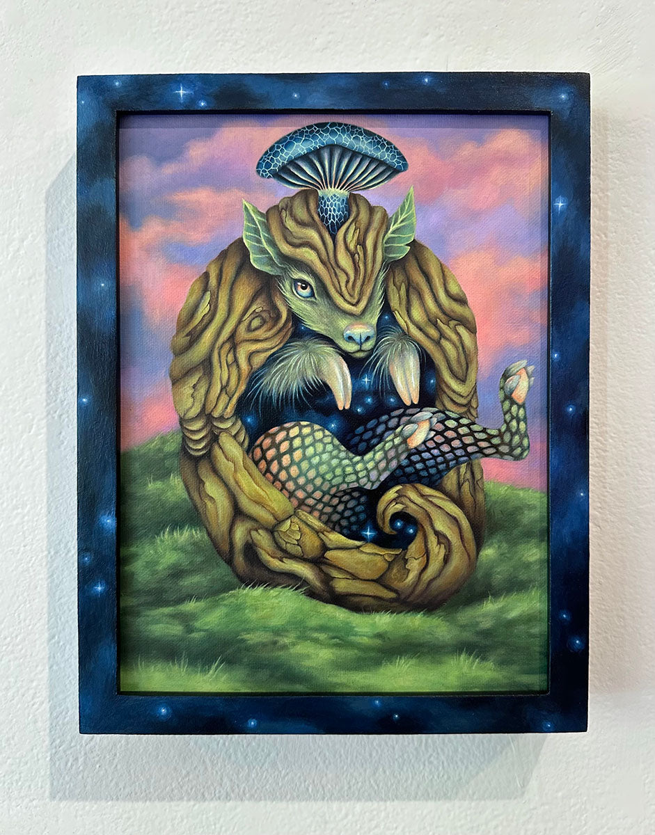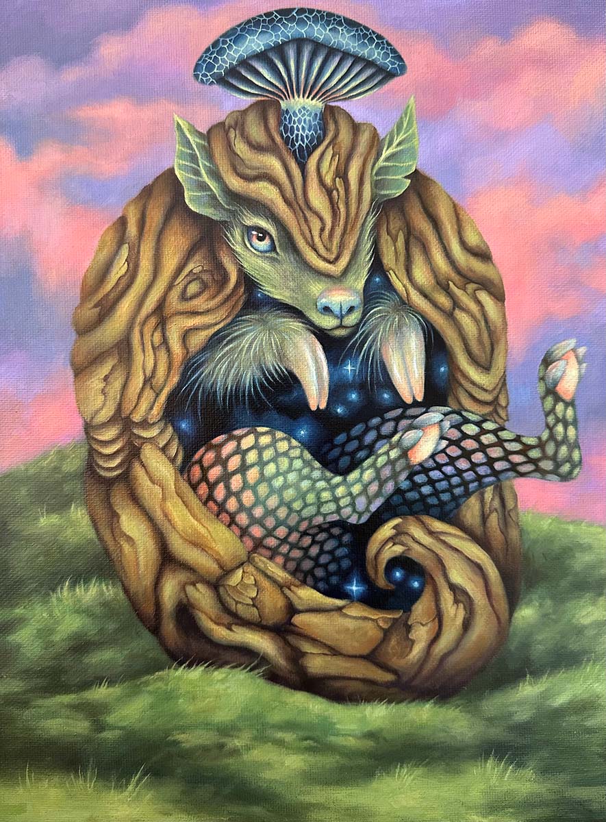 Jennika Bastian is a San Francisco based magical realism painter and mask maker. One of her favorite quotes is "Myths are public dreams, dreams are private myths" by Joseph Campbell. She views her artwork as a dance between these realms. When Jennika was 5 years old she taught herself how to