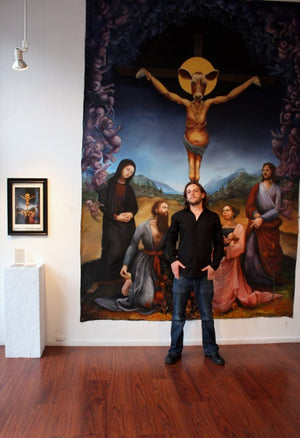 • Bradley Platz’ intricate oil paintings deal with the alternating nature of worship in the modern age. Using classical symbolic imagery from old world traditions and transposing subtle hints of modernity, his work might best be described as tarnished elegance.  Ever present also are certain whimsical and subtle symbols that carry the viewer through his body of work as a reader through a story, or a craft on the sea.