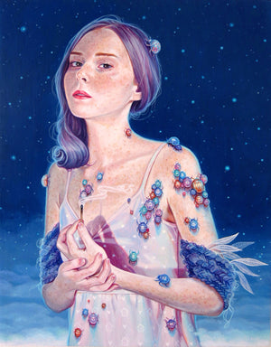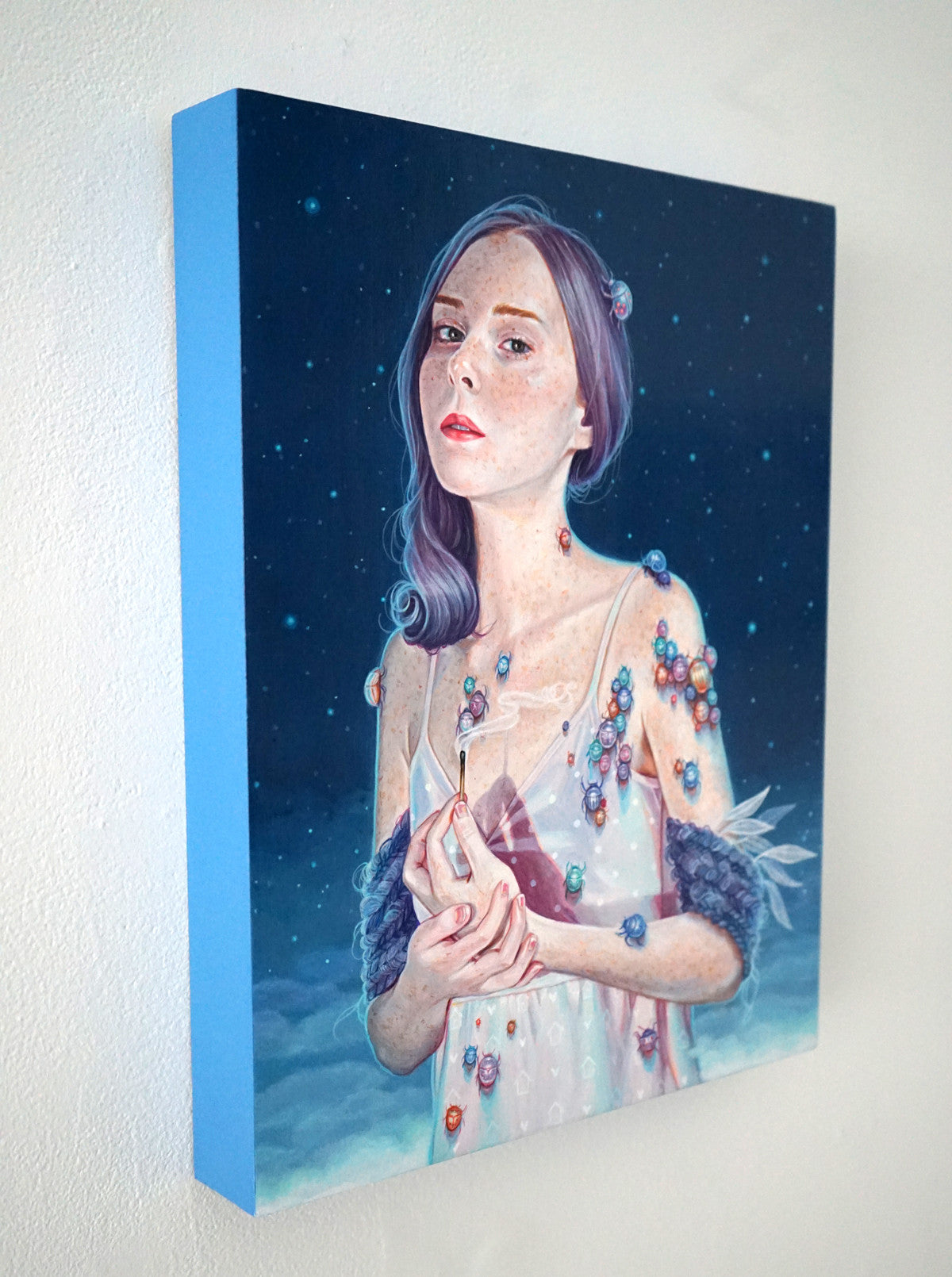 • Edith Lebeau is a Canadian artist based on the north shore of Montreal, Quebec. She spends most of her time painting in her studio with her Evil cat named Jack. For some time, Lebeau lived in the countryside, surrounded by fields, forest and a distant horizon line.  Lebeau tells stories through the portraits that she creates. She paints strong female figures and intricately pairs them with fauna and flora elements that are facing their own insecurities. She draws inspiration from her own experiences as well as from nature, pop culture, movies, music videos, fairy tales and various mythologies. Her works has been exhibited in Montreal, Berlin, Rome, Los Angeles, Las Vegas, San Francisco and New York among other cities.