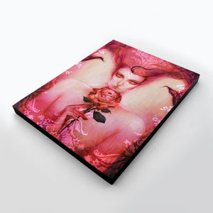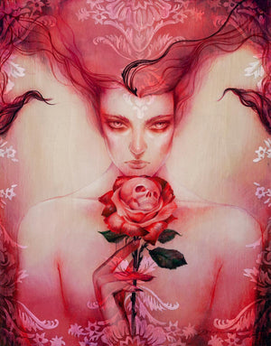 Lara Dann is a talented American artist who creates amazing paintings that depict fantastical figures in the midst of contrasting themes – such as light and dark, lust and innocence, knowledge and naivete. Her work is inspired by vintage and antique wallpaper tapestry which is featured in most of her underlying work.