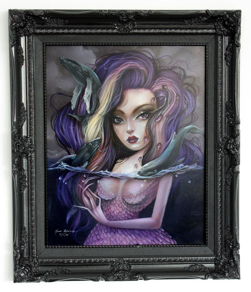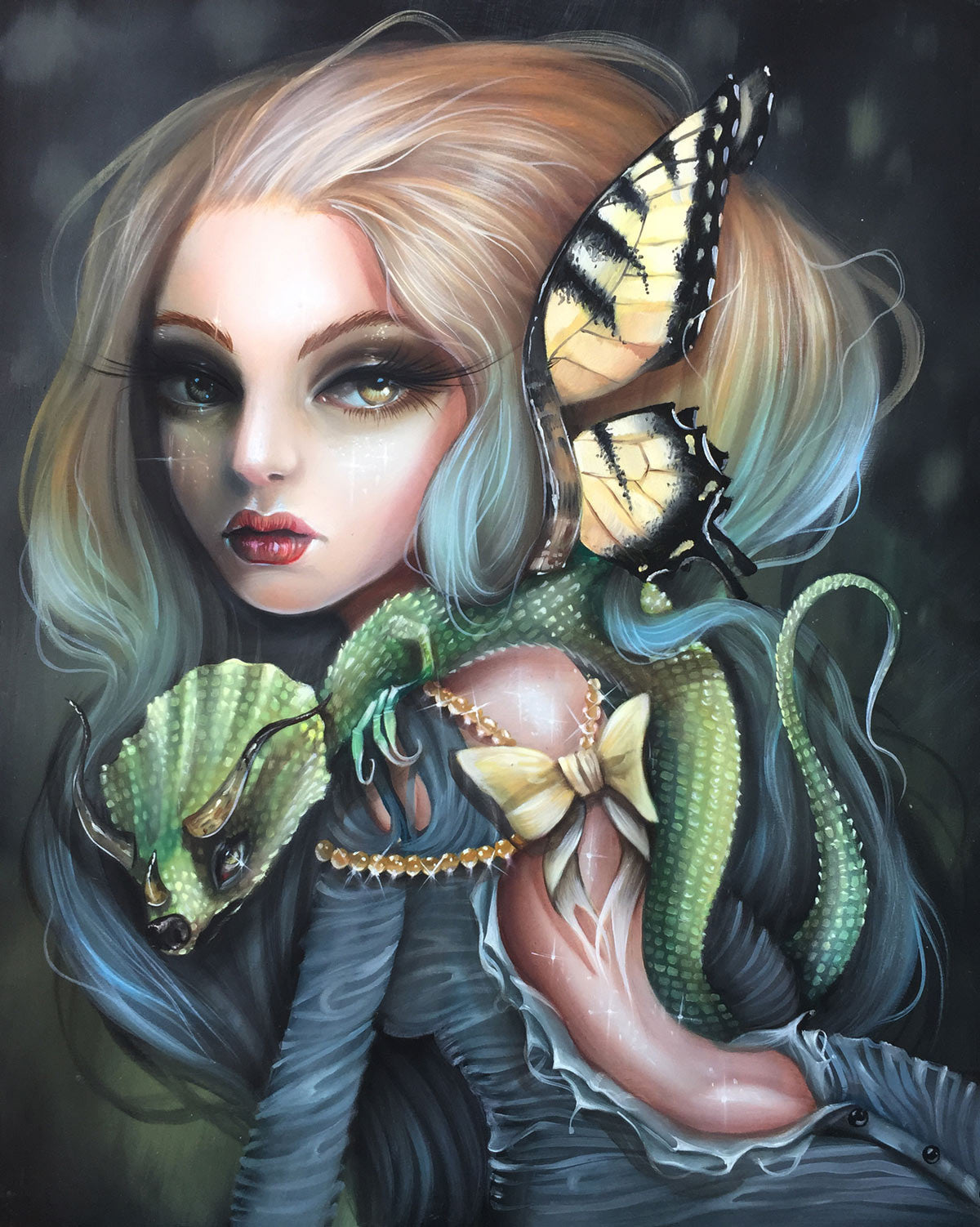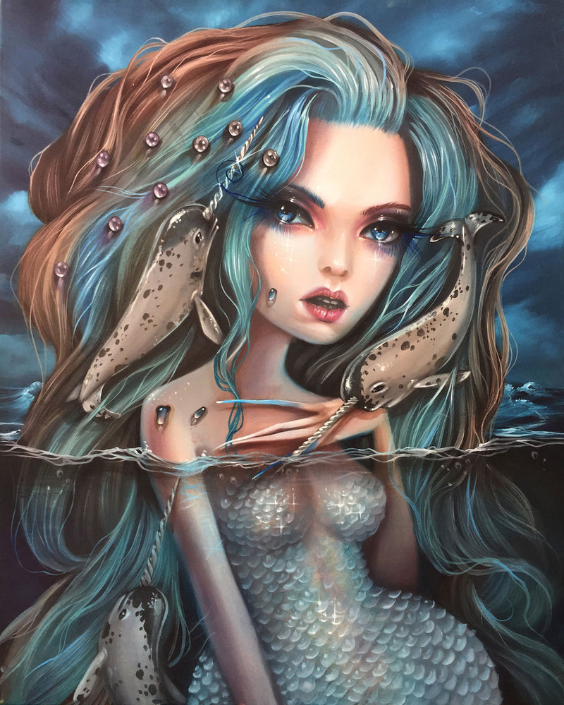 Utilizing a bold color palette and with a skillful hand, the artist portrays graceful and captivating subjects who embody both darkness and light. With a vibrant intensity, they encourage the viewer to let the extraordinary surroundings take over and encounter these beautiful, yet dangerous worlds.