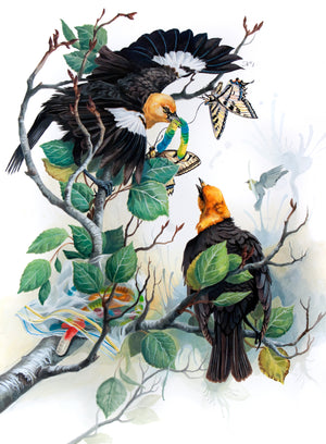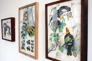 • J.S. Weisgraduated from James Madison University in 2005 with a BFA and a concentration in printmaking. Weis began exhibiting his artwork internationally as well as across the United States in 2014. His current works mix flora, fauna, and little artifacts of human production, exploring the space between the idealized purity of nature and the day-to-day consumption that threatens it. The artist currently live in Portland, OR.