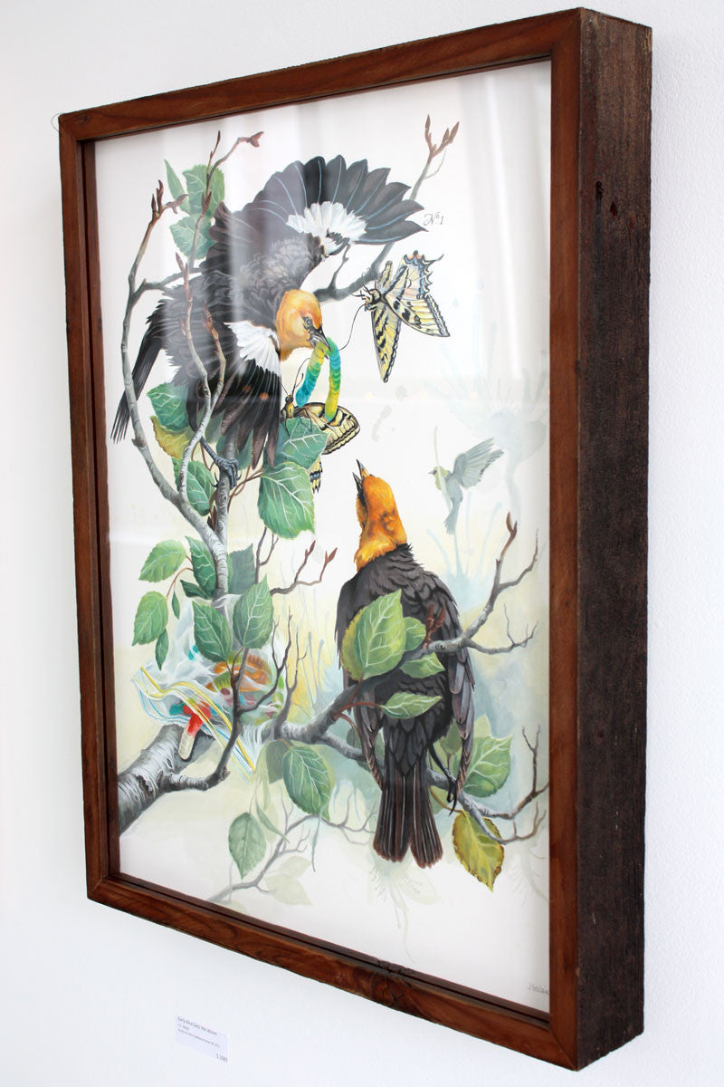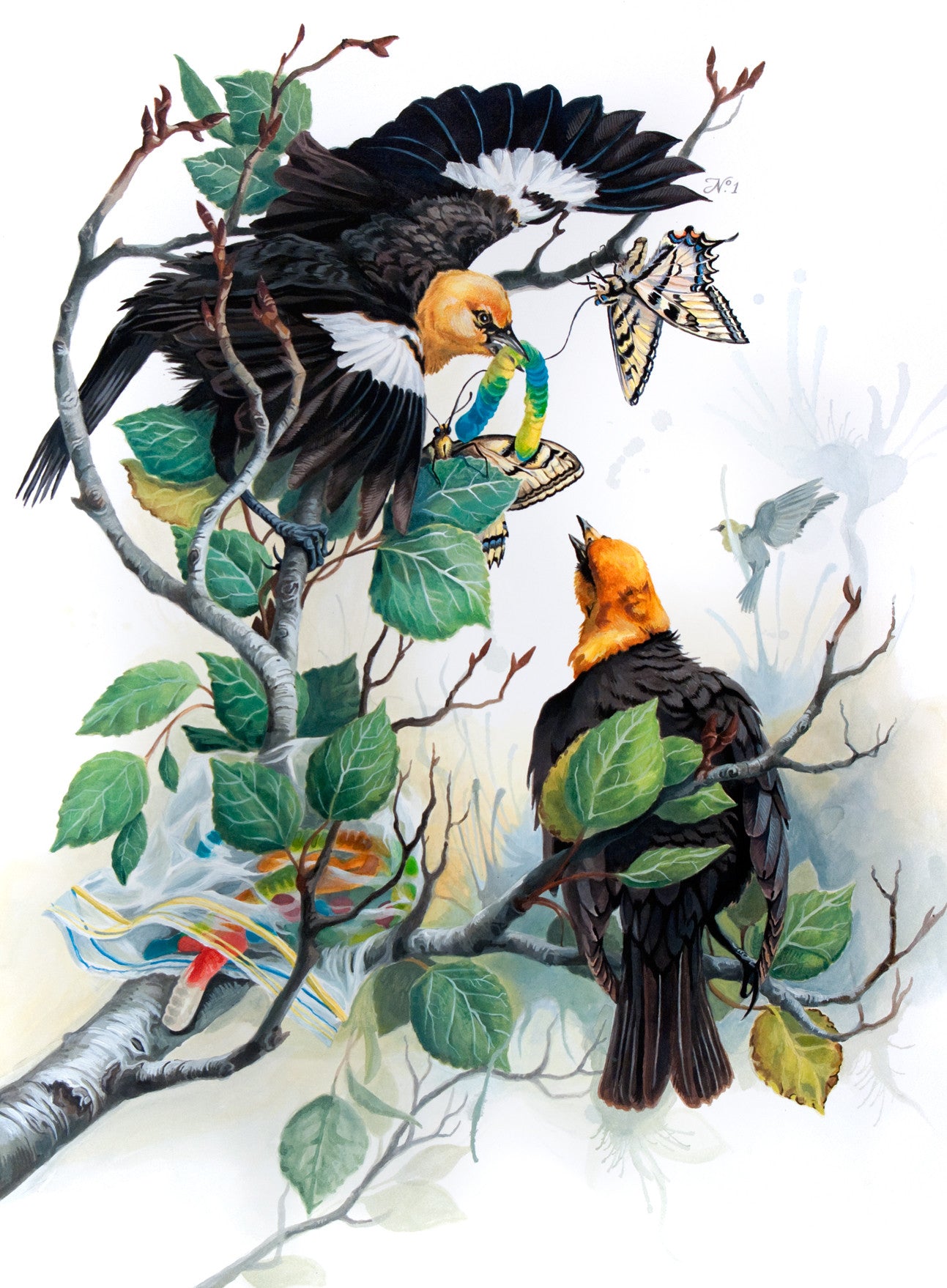 I found a way forward looking through the prints of Enlightenment era naturalists like Ernst Haeckel and John James Audubon. I imagined what it would be like if an alien Audubon came to earth now and began cataloguing the things he saw with a stoic, scientific eye. Would he separate what nature makes and what we make? What would an alien naturalist’s painting look like if the nice, neat division between nature-made and man-made were taken away? In a way the things we make are made by nature, since we originate from nature. Reflecting on the question further, I noticed that when I would go hiking or camping I inevitably found discarded artifacts of human production, and so it felt authentic to my lived experience that I should start including these objects. As I worked on this body of paintings I discovered that by studying the small products that human beings crank out side by side with plants and animals I could relate a natural ecosystem to the encroaching system of human production that feeds off of it. By comparing the abundance of a renewing natural world next to the illusion of abundance that we sell to ourselves, I could explore ideas about why we build the way we do and the needs these products attempt to fulfill. Though the idea that nature has something to teach us about ourselves may seem quaint and old-fashioned, I still think that many of our best ideas come from listening closely to what it has to say.