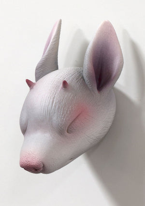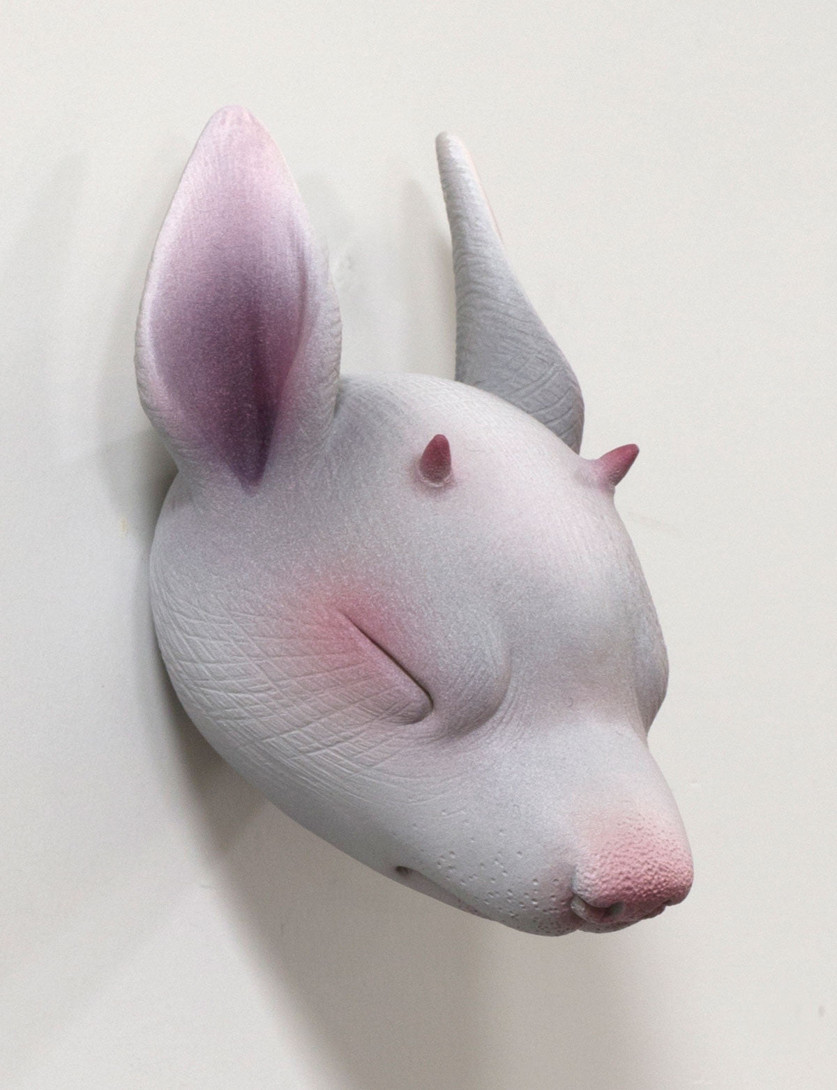 Exhibition Statement from the Artist: My work is about my fears and concerns. Growing up, I was always bullied by other kids, causing me to develop constant, uncontrollable anxiety. My parents got me a dog to help me cope; his name was Chapes, and we became very close. He made me happy and I loved him, but he had his dark side too. He would occasionally bite me, causing me to feel betrayed and sad. This experience led me to use a dog to represent myself in my work, having both a light and dark side. The dogs in my artwork all have unusual details–three eyes, two tails, extra legs and arms– that represent the anxieties that are still a part of me. The rats and birds present with the dogs are further extensions of myself and my fears. My parents own a restaurant, and I used to see my dog Chapes chasing rats around the outside of our building. I perceived this as a metaphor for me chasing and eventually facing my fears. Birds, like my anxieties, are difficult to contain and control, and are always a part of me and my work.