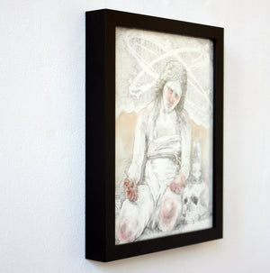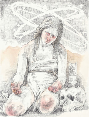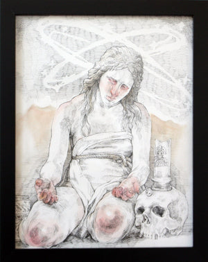 Helen Bayly works and resides in San Francisco, where in 2001 she originally came to study painting at the San Francisco Art Institute. Her artwork explores contemporary topics through stylized mythological and religious imagery, primarily painted with monochromatic ink on large scale paper. Influenced by classical imagery used in the foundation of Western Art, Bayly enjoys the spectrum of drama and the epic nature of the human experience. Through her art she writes her unique saga borrowing classical imagery to express her relationship with the modern Californian youth culture.
