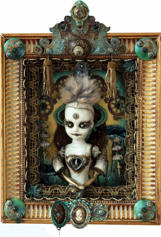 My mixed media assemblage work has evolved from a background equally routed in jewelry and metalsmithing, costume design, and a love for Gothic architecture, flea markets, and rock'n roll. Using a wide range of materials, including animal bones, cat claws, shark's teeth, doll parts, leather, fabric, wood, metal, vintage jewelry and various found objects, I strive to create a world that illustrates the beauty of the dark side. Giving new life to that which has been discarded, the transformed materials create altar-like forms that speak of innocence, loss, life, death, decay, and the dusty, shimmery shadows that are sometimes left behind. ~Wendy Gadzuk