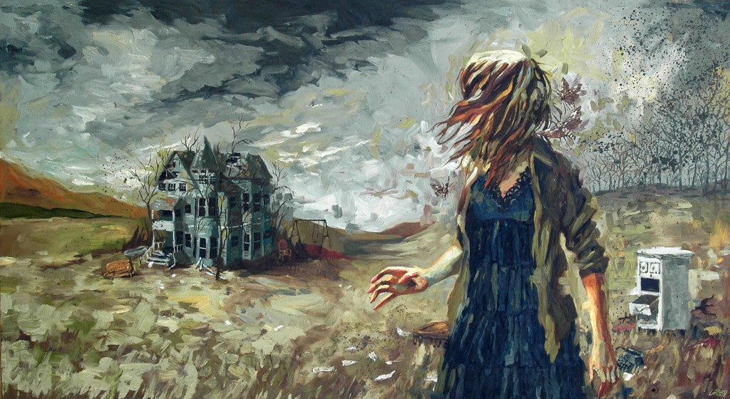 Lacey Bryant lives in the SF bay area where she paints almost every day. Her expressive oil paintings capture haunting narratives between her subjects. Characters inhabit a realm of strange, nostalgic sweetness with undercurrents of darkness and mystery. When Lacey isn’t painting, she likes to go hiking, knit, play with her cat, Hecubus and eat cupcakes. She also paints scenery for theatre and haunted houses.