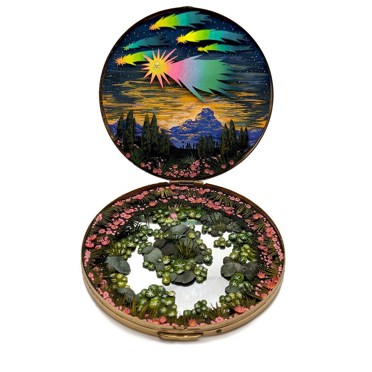 Often conjuring the decorative and figurative qualities of the raphaelites and aesthetic movements, Taylor’s work is an exploration of beauty. In her paintings, heavy indigo skies are filled with stars, and flowers bloom from the backs of languid, lovely women; the world that Taylor has made is gilt, prismatic, and lovingly wrought.