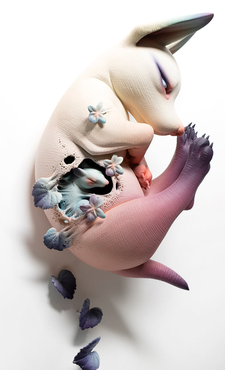 Erika Sanada's early inspirations stemmed from creatures and characters of horror films. Watching these stories were a way for her to escape unpleasant realities during childhood. She creates intricate, hairless ceramic creatures—often adorable but also unsettling and bizarre. Her artwork has been published in Hi-Fructose Magazine, Hey! Magazine, and Beautiful Bizarre Magazine. Her recent works are a part of the permanent collection of the Crocker Art Museum (Sacramento) and are currently being exhibited at the prestigious Fondation Bernardaud (Limoges). Sanada is represented by Modern Eden Gallery in San Francisco where the artist currently lives and works.