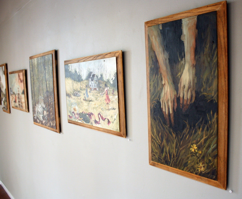 Lacey Bryant lives in the SF bay area where she paints almost every day. Her expressive oil paintings capture haunting narratives between her subjects. Characters inhabit a realm of strange, nostalgic sweetness with undercurrents of darkness and mystery. When Lacey isn’t painting, she likes to go hiking, knit, play with her cat, Hecubus and eat cupcakes. She also paints scenery for theatre and haunted houses.