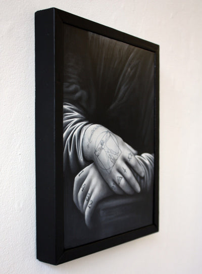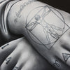 "The overall piece is meant to be a tribute to Leonardo Da Vinci. 1452, is his birth-date, and on the wrist is a replica of his signature. The pinky is an Aries symbol, which is his zodiac sign as well as an Illuminati symbol. Sometimes Leonardo is given credit for being a forefather of the Illuminati so the finger tattoos are plays on that symbology, the all seeing eye, inverted cross, and 6 pointed star. Da Vinci is known for his symbology in his paintings and I wanted to pay homage." -M