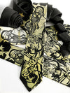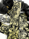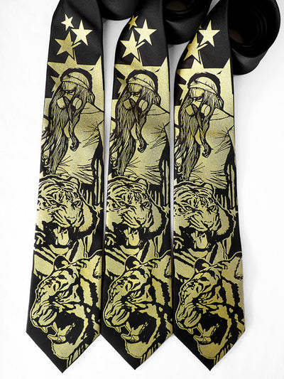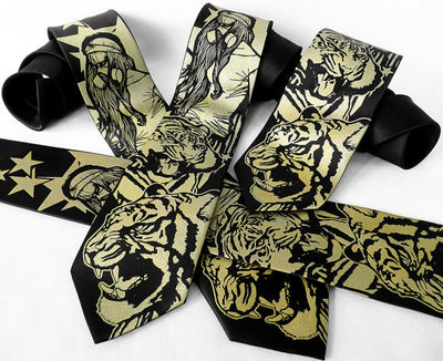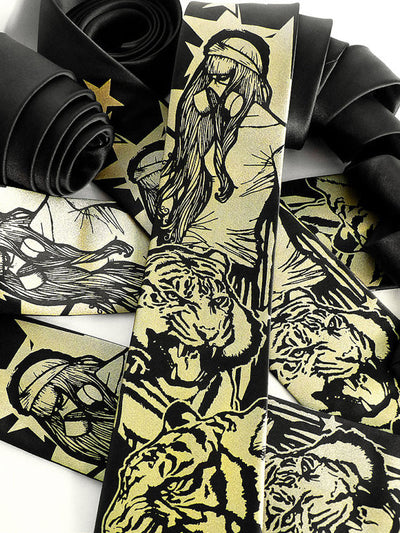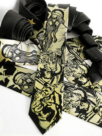 This gas mask girl and her tigers burn brightly in metallic gold ink on a black necktie. This design is based on "Tigers", an original painting by Cody Vrosh.